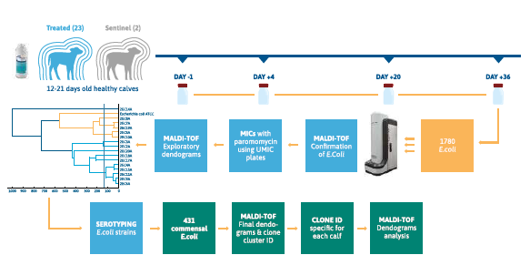 Twenty-five healthy calves aged 12 to 21 days, originating from seven French farms, were included in the study. They were housed collectively, fed milk replacers twice daily, and randomized into a treatment group (Gabbrovet Multi®, Ceva Santé Animale, 150 mg/kg daily for five days; n=23) or a control group without treatment (n=2). Daily monitoring included fecal consistency, depression scores, and appetite (evaluated on a 0-2 scale). Fecal samples were collected at four time points: before treatment (Day-1), during treatment (Day+4), and after treatment (Day+20, Day+36). Samples were immediately frozen at -80°C then transferred to the microbiology lab for isolation and microbiological analysis of commensal Escherichia coli strains. For each fecal sample, 20 purified and randomly selected E. coli olonies were selected. To manage the high number of strains, related strains were grouped using mass spectrometry (MaldiTof Biotyper Compass Explorer software). Minimum inhibitory concentrations (MICs) for paromomycin were determined using a customized microdilution method (UMIC), along with aminoglycoside antibiograms following CLSI guidelines. Resistance evolution was tracked by comparing strain data at different times relative to Day-1, using the CA-SFM kanamycin breakpoint for Enterobacteriaceae.