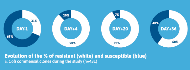 A total of 1,780 E. coli strains were isolated and analyzed. On Day-1, commensal E. coli populations comprised 69% susceptible and 31% resistant clones. Treatment with paromomycin did not induce resistance in previously susceptible E. coli clones. Instead, the treatment eliminated a substantial proportion of susceptible E. coli, resulting in a temporary predominance of preexisting resistant clones within the intestinal microbiota. This disruption was short-lived, as susceptible clones began to reappear post-treatment. Indeed, by Day+36, susceptible E. coli accounted for 40% of the population, compared to 7% on Day+20, 10% on Day+4.