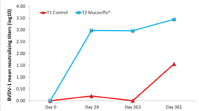 Mucosiffa® (Ceva Santé Animale) is a modified-live vaccine (MLV) used for the control of bovine viral diarrhea virus (BVDV) infection. In pregnant heifers experimentally challenged by BVDV-1, one administration of Mucosiffa® 126 days before challenge had been proven to prevent fetal infection1. Because current practices in cattle farms favors yearly vaccination schedules, a new experiment was carried out to evaluate the level of fetal protection obtained in pregnant heifers challenged twelve months after one administration of Mucosiffa®.