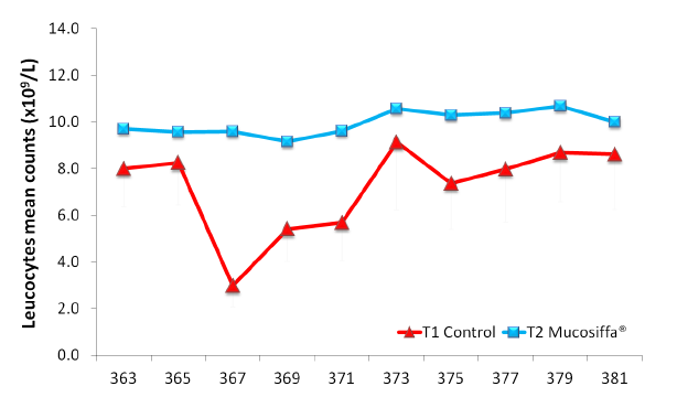 In control heifers, post-challenge period was marked by a peak of rectal temperature (RT) at day 367 (mean=39.6°C) and a marked decrease in leucocytes and lymphocytes counts. On the opposite, RT and hematological parameters of vaccinated heifers remained unchanged during the post-challenge period.