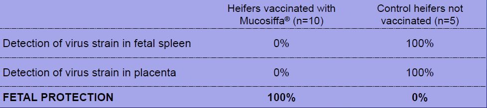 32 Holstein heifers free of BVDV were randomly allocated to one of the following group at day 0: T1 control (non vaccinated heifers, n=12) or T2 (heifers vaccinated with Mucosiffa®, n=20). All heifers were synchronized and received AI at day 276/277. On day 363, 15 pregnant heifers (5 from group T1, 10 from group T2) were challenged via the intranasal route with a BVDV-1 strain. Heifers were euthanized 28 or 29 days after challenge and their fetuses were harvested for the detection of the challenge virus in placenta and spleen (rt-PCR). Blood samples were collected from heifers at various times in the study to document their serological status (neutralizing antibody titers) and hematological parameters.