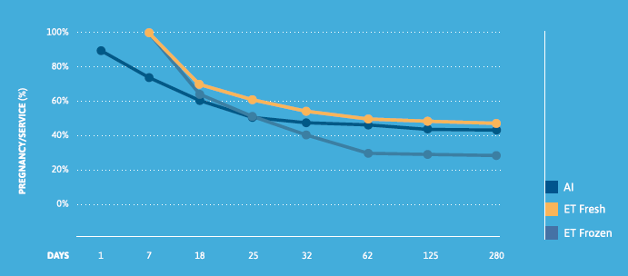 The predicted probability of pregnancy (%) varied at each time point (days 7, 18, 25, 32, 62, 125, parturition) depending on treatment (AI: 77.0, 60.2, 52.3, 48.8, 47.0, 44.6, 44.0; fresh ET: 100.0, 69.5, 60.3, 56.1, 48.4, 46.8, 45.5; frozen ET: 100.0, 61.7, 52.2, 41.6, 32.9, 31.8, 30.2). Regardless of treatment, the largest proportion of pregnancy loss occurred from the service event (AI on day 0 or ET on day 7) to day 18, with minimal loss occurring between day 62 and parturition (AI: 1.8%, fresh ET: 1.9%, frozen ET: 3.5%). Treatment differences in the predicted probability of pregnancy per service event were detected between fresh ET vs. frozen ET on day 32, and both AI and fresh ET vs. frozen ET on days 62, 125, and at parturition. There was a greater probability of pregnancy loss between days 32 and 62 following ET (Fresh: 11.3%, Frozen: 18.0%) than AI (4.0%). The percentage of cows that calved following the transfer of a fresh embryo (45.5%) was similar to AI (44.0%), but lower when a frozen embryo was transferred (30.2%).